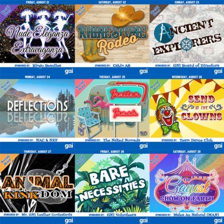 GNI encourages participants at the themed Social Hours to be as creative as you would like, but in a manner that is appropriate to the theme and consistent with the nudist character of The Gathering. Have fun with it! (Confused about a theme? We recommend you Google it!)